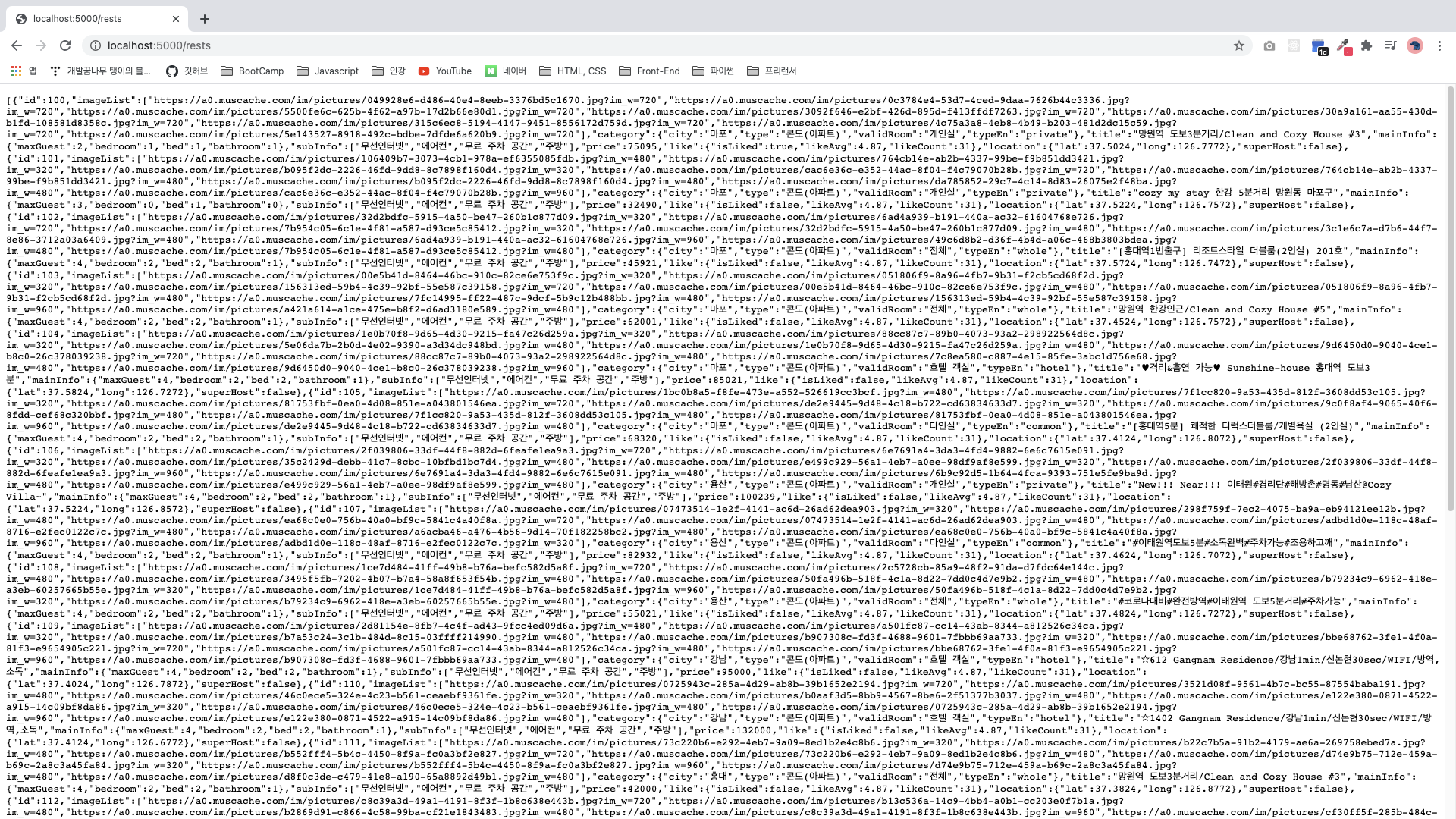 RestsAPI는 서버링크다.(http://localhost:5000/rests) 여기서는, 기본적으로 내가 DB파일에 넣은 20개의 숙소 리소스를 제공한다.