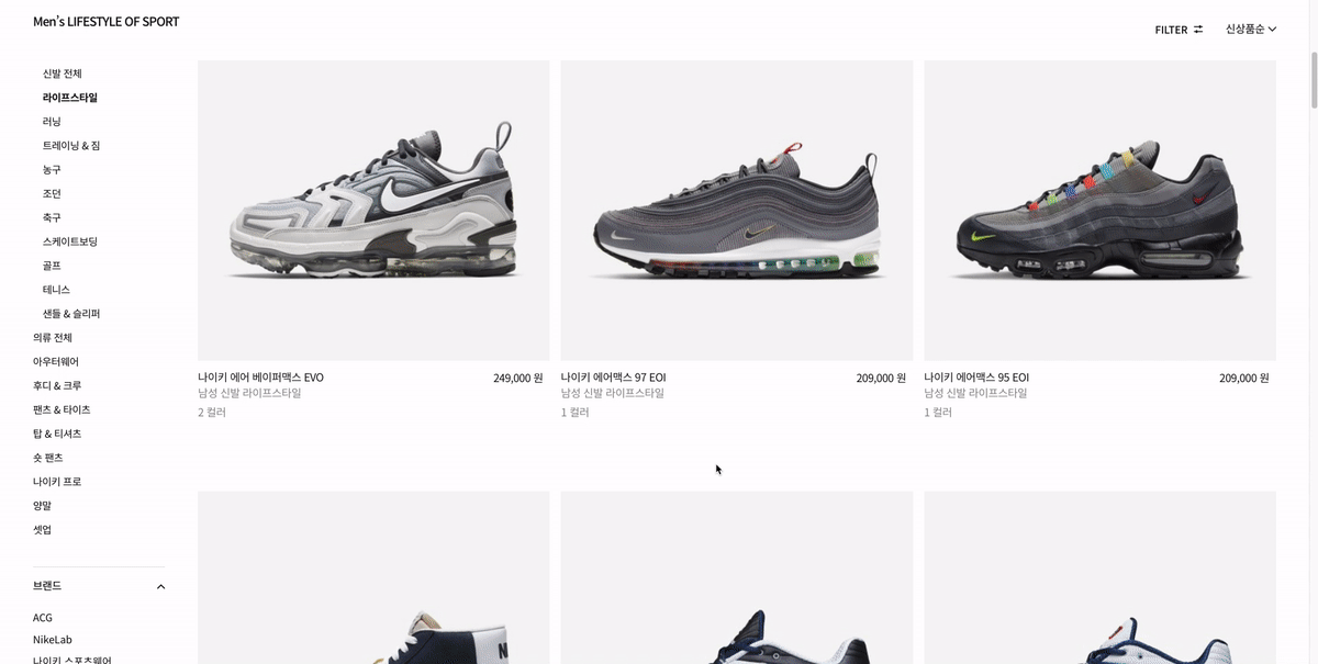 3차 프로젝트로 Nike 사이트 클론을 진행하면서, List 페이지를 연구하는테 아이템을 페이지네이션이 아닌 "인피니트 스크롤" 로 이어붙이는 로직으로 구성되어있는 것이었다. (아래는, 원본 사이트 영상)