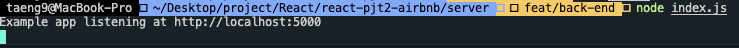 이제 서버를 시작해보겠다. 터미널에서 node index.js 명령어를 실행한다. (React 의, npm run start 와 같다고 생각?!)