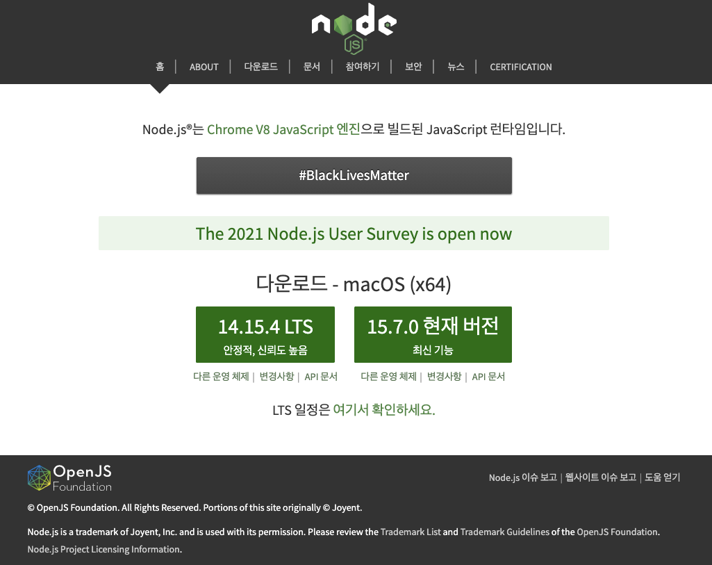 * Homebrew 와 같은 패키지 매니저를 통해 설치할 수도 있다. (nodejs.org/ko/download/package-manager/)