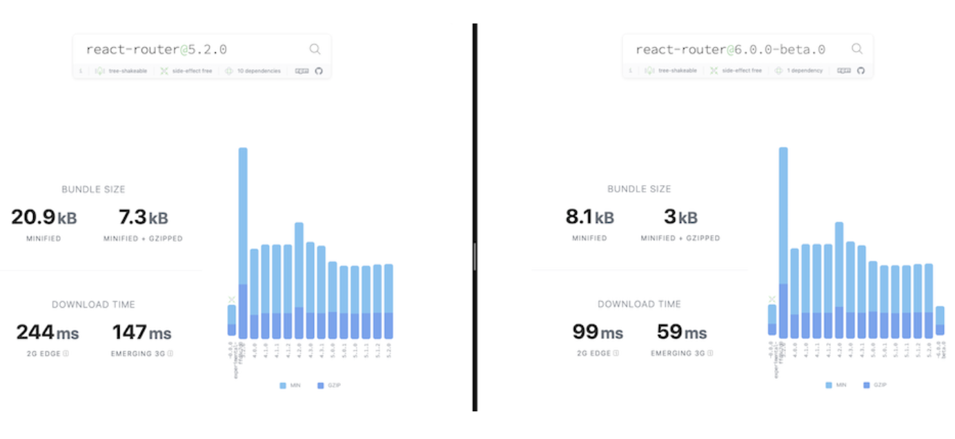 React Router 6버전은 번들 사이즈가 5버전에 비해 약 70%가 감소하였으며, 이는 App 빌드시 큰 이점이 될 것이다.