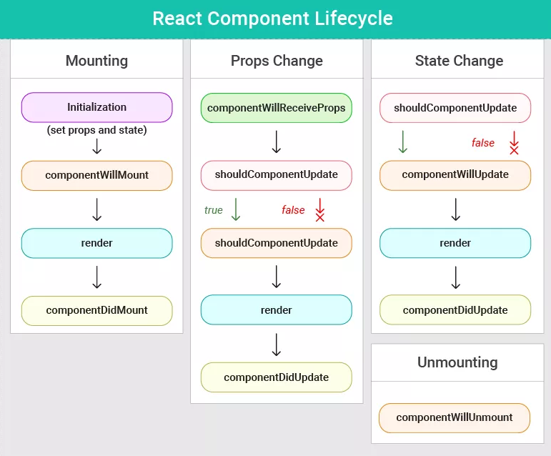 - Unmounting: 컴포넌트가 DOM에서 제거되는 과정이다. 삭제될 컴포넌트에 대해 'componentWillUnmount' 메소드를 호출한다. Unmount를 통해 이벤트리스너 등 컴포넌트와 연결된 요소들을 정리하며, 동작이 완료되면 따로 DidMount를 호출하진 않음.Unmount가 끝난 컴포넌트는 다시 Re-mount 되거나 하지 않는다.(Lifecycle 종료)