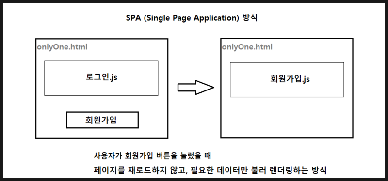 기존의 MPA 와 가장 큰 차이는, 각 주소가 HTML 페이지가 아닌 JS파일(컴포넌트)을 불러와서 뷰를 수정하는 'Routing' 방식으로 구현된다.