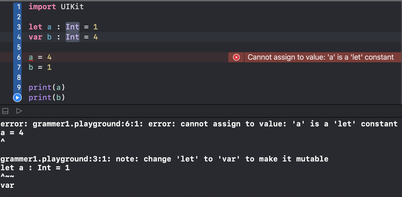 let [변수명] : [타입(생략가능)] = [값] let b : Int = 2또한, 상수는 값을 변경(재할당)하려는 경우 에러를 발생시킨다. 그래서, 상수에는 보존하고자 하는 값을 저장하여 메모리 누수를 방지한다.